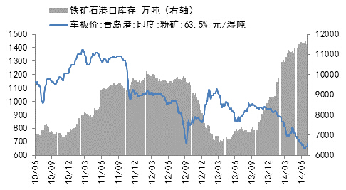 庫存歷史高位,據我的鋼鐵網統計,截止7月4日,鐵礦石港口庫存合計約11618萬噸。