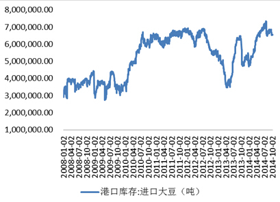 此外,我國進口大豆港口庫存水平依然維持在較高水平運行,截至10月28日,其庫存水平為6557500噸,港口進口大豆庫存水平依然高企,只要油廠的開機率維持在一定水平,也就意味著豆油的流通量將得到保證,即潛在供給量呈增加態勢發展,這在一定程度上也抑制了豆油價格上揚。下圖4為我國港口進口大豆庫存走勢。