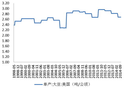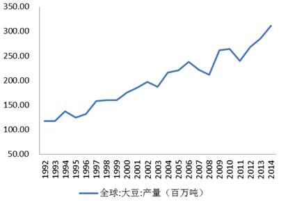 美國農業部10月公布的供需報告數據顯示,全球大豆供應朝向寬鬆方向發展的總體基調依然沒有發生改變。與市場預期的方向一致,美豆的單產及產量預測均繼續上調,雖然上調幅度不及市場預期水平,但仍然是創紀錄豐產的水平,供應量大幅增加的格局未發生變化。統計數據顯示,美豆單產達到47.1蒲式耳/英畝,產量預測達到39.27億蒲式耳,屬於創紀錄的豐產水平。此外,南美產量方面未做調整。維持巴西2014/15年度大豆產量9400萬噸的預估,維持阿根廷2014/15年度大豆產量5500萬噸的預估。從上述數據分析來看,大豆供應量的大幅增加將令包括豆油在內的豆類價格承壓。隨著美國農業部10月報告的公布,市場下一步的焦點將轉向需求以及南美天氣的炒作,如美豆新作上市后的需求變化情況,南美大豆播種的天氣狀況以及中國進口大豆采購進度等。美豆單產走勢如圖1所示,圖2為全球大豆產量走勢,從數據圖中可以清晰地看出,單產以及產量均處於相對高位水平。