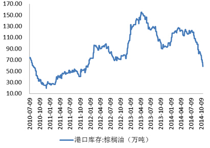 此外,隨著時間的推進,天氣逐漸轉涼,而棕櫚油熔點較高,故而其消費或漸進減少。正因為如此,馬來西亞棕櫚油出口量以及中國棕櫚油進口量均不容樂觀。就10月份出口數據來看,馬來西亞棕櫚油出口疲軟,依據馬來西亞當地船貨調查機構its的最新統計數據顯示,馬來西亞10月1-20日出口棕櫚油為894697噸,較上月同期的996065噸下降了10.2%。其中,中國進口了147700噸。與此同時,另一船運機構sgs稱馬來西亞10月1-20日棕櫚油出口量為884628噸,較9月同期的998689噸減少了11.4%。其中,中國進口了101800噸。與此同時,中國海關總署的統計數據也表明國內棕櫚油進口量在下滑,1-8月,國內棕櫚油進口量為281萬噸,同比下降10%。其中8月進口量為23.1萬噸,較7月大幅減少9.85萬噸。上述的統計數據均表明,棕櫚油市場乃至整個油脂板塊因需求不濟而上揚動力不足,即終端需求對油脂行情的推動作用有限。國內棕櫚油港口庫存走勢如圖7所示。