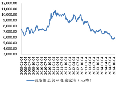 在世界經濟整體疲軟的大環境下,美國經濟2014年卻呈現出強勁的復甦勢頭。統計數據顯示,2014年上半年美國gdp實際增速已回升至4%,9月美國失業率下降至5.9%,創2008年次貸危機以來新低。上述因素表明,美國經濟復甦較為顯著。與此同時,我們注意到在經濟回暖的帶動下,美元指數大幅上漲,這在一定程度上打壓了包括油脂在內的大宗商品。此外,2014年下半年以來,國際原油價格震盪下滑,這主要是由於新興國家經濟增速下滑、歐元區經濟復甦緩慢以及美國頁岩氣革命沖擊等多方面因素共同作用所導致的。國際原油的下跌,對油脂形成利空效應,因為植物油脂是生物柴油的原料,原油的大幅下跌導致了生物柴油經濟性下滑,從而抑制了植物油脂的燃料化需求,進而使得油脂價格承壓。