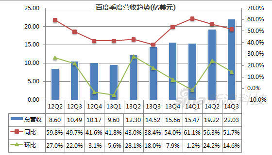 -百度第三季度總營收為人民幣135.20億元(約合22.03億美元),比去年同期增長52.0%;