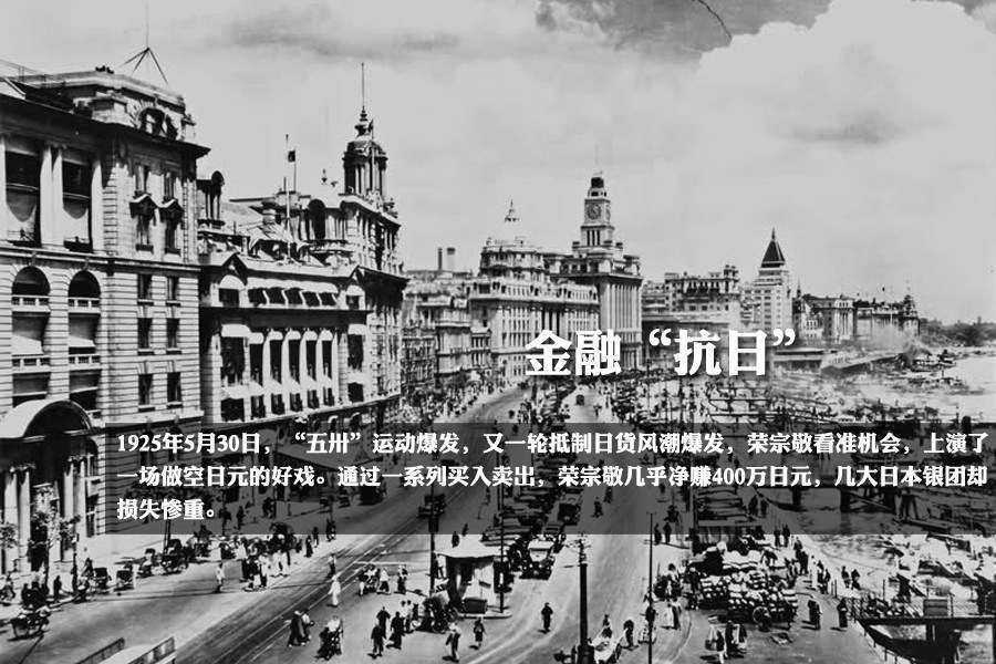 1925年5月30日,“五卅”運動爆發,又一輪抵制日貨風潮爆發,榮宗敬看準機會,上演了一場做空日元的好戲。榮宗敬先是一連幾天大量拋售日元,逼迫日元匯價狂跌不止。當收到日本幾家大銀行組成銀行團來出面維持日元后,指示下屬立即“空翻多”,不露痕跡地吃進200萬日元。當在日本銀行團出面維持下日元出現回升時,榮宗敬又讓下屬繼續公開地拋售大量日元,同時派人制造各種日元將下跌的輿論。一時間連上海各銀行、錢莊、歐美商人及銀行也開始大量拋出日元,外匯市場上日元一日不如一日,匯價再次急劇下跌。此時榮宗敬殺了個回馬槍,動用全部資本購進遠期日匯(期限為6個月),為了籌得資金進行這次規模空前的日匯投機,大量售出積壓的粉、紗存貨,並不惜以低價拋出遠期棧單。半年后,日元匯價逐步上揚,榮宗敬按照新的比價兌回到期的日匯,幾乎凈賺400萬日元,幾大日本銀團卻損失慘重。