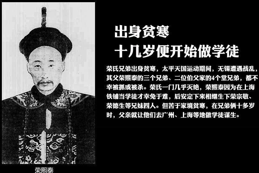 榮氏兄弟出身貧寒,太平天國運動期間,無錫遭遇戰亂,其父榮熙泰的三個兄弟、二位伯父家的4個堂兄弟,都不幸被抓或被殺。榮氏一門幾乎滅絕,榮熙泰因為在上海鐵鋪當學徒才幸免於難,后安定下來相繼生下榮宗敬、榮德生等兄妹四人。但苦於家境貧寒,在兄弟倆十多歲時,父親就讓他們去廣州、上海等地做學徒謀生。