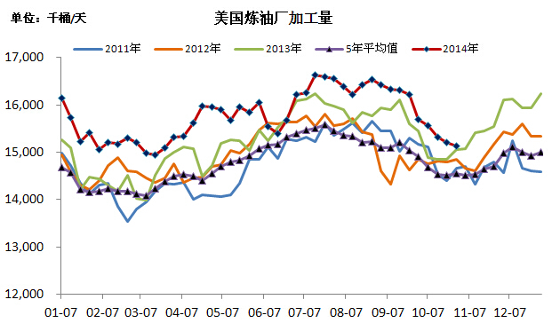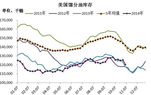 盡管進口量出現下降,但開工率小幅下降以及產量增加導致美國原油商業庫存繼續大幅上升。不過,餾分油庫存大幅下滑對周三國際油價形成一種支撐。未來,隨著天氣逐漸轉冷,取暖油需求有望逐步回升,這將加快餾分油庫存的去庫存化。但是,隨著煉油廠的檢修結束,開工率有望繼續重回升勢,這反過來會加大餾分油庫存壓力,因此餾分油庫存后期的變化將取決於氣溫的變化,如果今年屬於暖冬,那么餾分油庫存對國際油價還將存在。