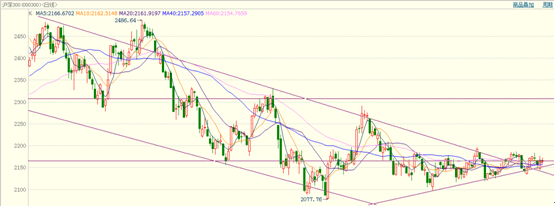 總持倉:15.5萬手,較昨日持倉大幅增倉4600手。周一行情上午小幅反彈至2165點附近,下午再度回落至2150點后反彈至2160點。與昨天收盤基本平盤。期指以頸線位為中軸上下10點進行窄幅整理,市場尚未指明方向。