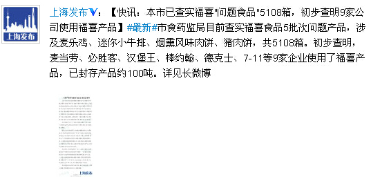 A股港股上海初步查明:麥當勞必勝客等9家公司使用福喜產品鉅亨網新聞中心2014-07-22 19:20 【快訊:本市已查實福喜"問題食品"5108箱,初步查明9家公司使用福喜產品】#最新#市食藥監局目前查實福喜食品5批次問題產品,涉及麥樂雞、迷你小牛排、煙熏風味肉餅、豬肉餅,共5108箱。初步查明,麥當勞[微博]、必勝客[微博]、漢堡王、棒約翰、德克士、7-11等9家企業使用了福喜產品,已封存產品約100噸。(本新聞來源:和訊網)文章標籤更多鉅亨講座看更多講座公告上一篇國家物流信息平台簽約阿里雲 挖掘大數據價值下一篇FT:中國負債飆升令人擔憂0