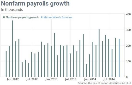 華爾街正在等待一份理想的報告,市場主流預期認為,美國10月非農就業人口可能增加24.3萬,8月、9月分別增加18.0和24.8萬的結果多半也會被上修。
