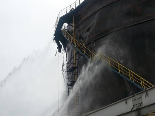 一位在現場的人告訴記者,現在沒有看見明火,但濃煙滾滾,煙是黑色的。此前,有網友說聽見爆炸聲。據現場一名消防人士介紹,現場燃燒的只有一個調節罐,並沒有影響到其他區域,該著火的油罐直徑約35米、高約25米。但由於這個含硫污水調節罐體積大、燃燒造成的溫度高、調節罐內含油量大,造成火勢暫難以撲滅。
