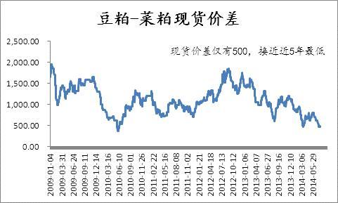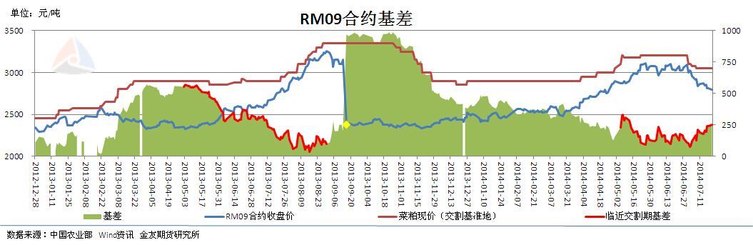 其三,1409菜粕版面多單的機會,根據當前的基差來看,菜粕1409的基差達到280,統計規律顯示,交割前一個月,菜粕的基差一般會回到100-150左右,而當前油廠挺價的意愿較強,近月合約或通過走高來實現基差收斂。重點關注未來進口菜籽的到港情況。