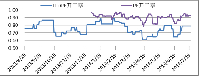 截至7月18日,pe總產能1316萬噸,開工率0.93。在產線性產能558萬噸,開工率0.79,從歷史開工率判斷,目前處於正常水平。后期,中煤陜西榆林pe裝置及煤化工pe裝置均將逐步投產,但目前來看,產品還未產出,預計將使得pe產能在三季度增長60萬噸左右。