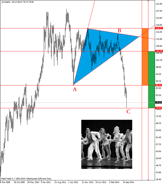 周圖圖表中根據波浪理論分析,前期所形成的b浪三角形的能量釋放目標為76美元/桶附近。因此,有理由說,原油已經接近底部,后市存在反轉或反彈。另外,從古老的周易理論分析------行情已經形成“豫”卦卦象,象征著空頭的大佬們正平倉了結、大賺一把,而且抑制不住激動的心情,正高興地在地板上手舞足蹈。因此,未來價位如果升破80美元/桶,可買入布倫特原油的看漲期權,目標位置為88美元/桶。