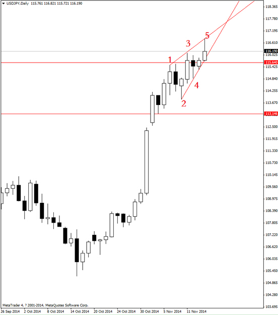 從過去一周以來的日線圖表來看,行情在古老的周易理論中形成八純卦之一的“巽”卦卦象,預示著后市行情稍有風吹草動,就會“無孔不入”。另外,根據波浪理論分析,行情有形成竭盡形態地“楔形”之嫌,即12345浪跡象明顯。因此,美元/日元的看跌期權存有交易機會:如果價位跌破前期低點115.60日圓,可買入美元/日元的看跌期權,目標參考為113.20日圓。(注:文中“風”指即將在周一公布的“日本第三季度gdp報告”。)