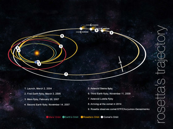 然而遺憾的是,火箭的推力並無法直接將飛船送往67P/楚留莫夫-格拉希門克彗星,因此科學家設計了一條複雜而精巧的迂迴借力的飛行路線——羅塞塔飛船在離開地球之后開始圍繞太陽“繞圈”,先后3次返回地球附近,一次飛過火星附近,借助這兩顆星球的引力場進行加速,並在經過10年的漫長旅程之后,於2014年8月飛抵目標。在它抵達目標之前,它還幸運地與兩顆小行星相遇,並對它們進行了考察,它們分別是第2867號小行星斯特恩斯(Steins),以及21號小行星魯特西亞(Lutetia)。