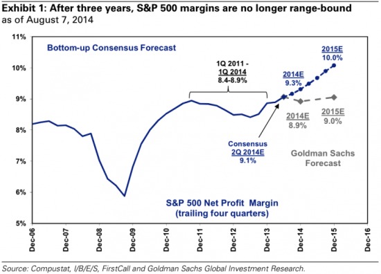 高盛可斯丁稱:“標普500公司利潤率創下歷史新高的9.1%,四年來首次突破了8.4%至8.9%這50個基點的區間。過去四季利潤率較2014年Q1 時擴大了17個基點。信息技術和醫療保健板塊對利潤率擴大貢獻最大。只有能源一個板塊利潤率下降,可選消費品板塊保持不變。”
