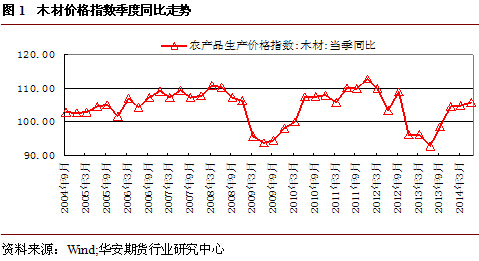 原料方面,從木材價格指數的季度變化來看,受國家政策和經濟環境影響,自2008年以來基本維持在90-110的區間內震盪,期間保持一定的規律性。本輪上升周期自2013年6月以來,已持續1年時間,且上行趨勢暫且保持完好。隨著近年來我國房地產市場的火爆,下游家裝需求驟增,目前我國木材年消耗量近5億立方米,已成為全球第二大木材消耗國。而我國林業資源匱乏,木材產量有限,2013年木材產量僅8367萬立方米,進口木材(原木+鋸材)7916萬立方米,對外依存度高達近50%。2014年4月1日起,東北大興安嶺地區全面啟動商業禁伐,而國內人工速生林數年內仍難彌補供應缺口,因此我國木材進口依存度將長期保持高位,龐大的供需缺口和定價權缺失下,木材價格劇烈波動風險將影響到下游板材生產企業的穩健經營。
