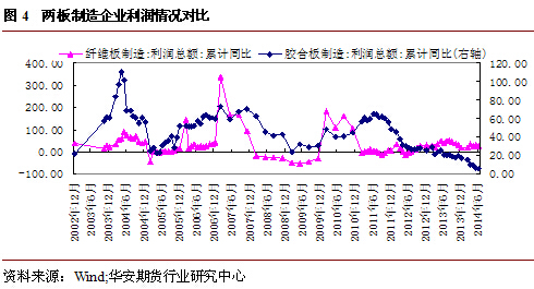 2012年以前,兩板制造企業的利潤情況基本處於寬幅震盪格局。期間波峰時膠合板制造利潤累計同比甚至達到近400%,而纖維板制造利潤累計同比也曾超越100%,板材生產利潤豐厚。但2012年以來,情況發生了明顯變化,國內需求的增長導致供應缺口擴大,板材生產企業進口原木和鋸材量快速增加,旺盛的需求刺激國際木材價格走高,導致占據膠合板成本近70%的生產企業壓力驟增。而受制於房地產調控政策影響,成本向下游傳導受阻,同時由於全國分布著大量的中小企業和作坊,產能分散,競爭激烈,膠合板制造企業利潤受到嚴重擠壓,利潤率持續下滑。纖維板雖然近年來受木材價格上升影響有限,但人工成本快速增加,也導致其生產利潤處於低位。這樣的格局或許需要行業重新洗牌、淘汰落后產能才能打破,而兩板期貨的上市或有助於加速這一進程。