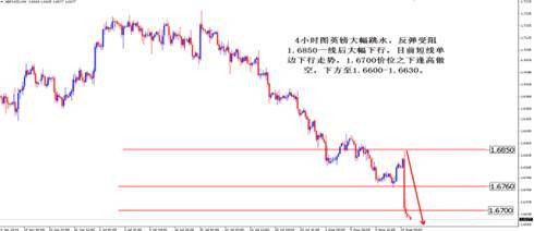 英鎊兌美元短線擴大跌幅,本周價格反彈受阻1.6850價位后沖高回落,昨日單邊下行走勢跌幅較大,短線仍處弱勢下方仍存下行空間,1.6700之下逢高做空,下方支撐1.6650,16630,1.6600。