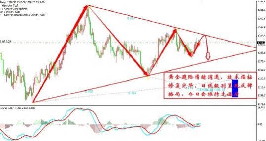 綜合研判,短期價格依舊位於1314-1305區間波動,在破位之前,操作毫無疑問的就是在此區間內高沽低渣,結合技術面指標,價格在回落修復到位后勢必還要一波上沖,但隨著地緣政治風險降低,避險情緒消退,下跌還會延續,也就是說近期的走勢會以先行反彈在下跌為主基調,那么我們的操作就是先多后空,由於是震盪走勢,操作上切記要等到可操作點位在進場。