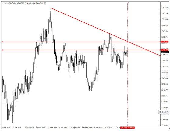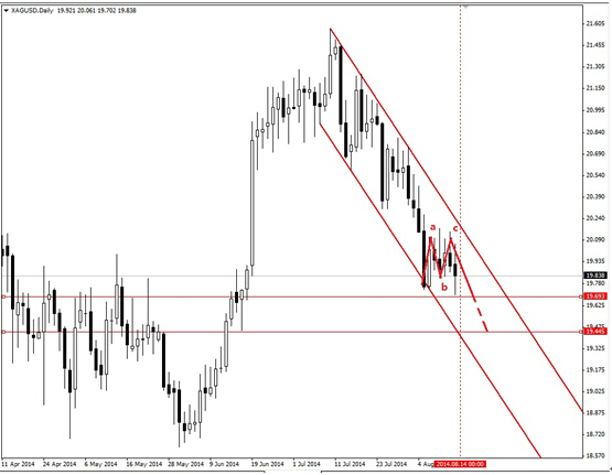 天圖分析來看,金銀在近期行情中偶會出現“分道揚鑣”之情形(20140805),白銀表現較黃金弱勢。因此,后市價位如下破19.70美元/盎司,可買入白銀的看跌期權,短期參考目標位置為19.45美元/盎司附近。