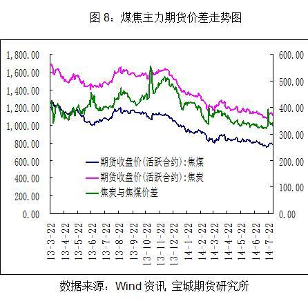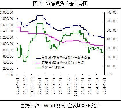 經過5-6月份現貨市場相對平穩的階段,從6月底起,煤企紛紛下調煉焦煤價格,個別企業連續幾周多次下調價格,市場信心明顯受到沖擊。煤炭行業今年新增產能投產的壓力仍然較大,然而煤炭需求表現低迷,煤炭企業經營困難。在煤炭行業不景氣的背景下,山西、內蒙等地方政府加大對於煤企的支援力度。雖然煤炭生產經營成本因稅費減免有所下降,但是在產能過剩以及市場低迷的情況下,煤企為了爭奪市場,市場競爭反而更加激烈,導致煤炭市場跌勢再起。焦炭方面,前期焦炭現貨價格保持平穩,總體波動不大,企業生產信心有所恢復,開工率有所回升。然而自6月底以來,建材銷售一蹶不振,房地產市場低迷使得淡季需求更顯清淡。由於鋼價弱勢運行,加之鋼廠對於焦炭的補庫需求有限,鋼廠對於原料價格的打壓力度加強,焦化企業不得不面對下游鋼廠打壓價格以及回款難的問題。由於上游煉焦煤價格大幅下挫,6月底以來焦炭價格也是展開新一輪下調,焦化企業利潤持續縮減,焦化企業經營壓力更加突出,並且焦炭與焦煤價差不斷收斂、