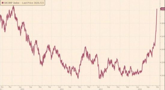6月底以來,上證綜指已經飆升43%,10月底以來的漲幅達到26%。實際上,中國央行11月底下調基準利率后的幾天內,股市就上漲超過了15%。