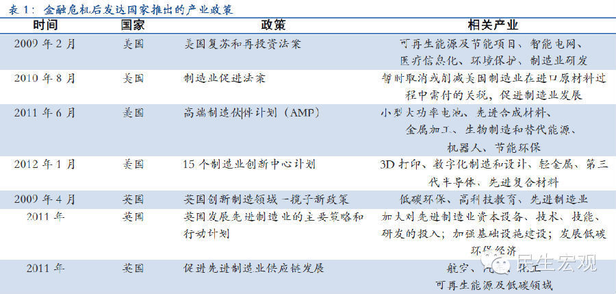 “再工業化”為了推動以制造業升級和發展新興產業為核心的產業結構調整。2009年以來,發達國家陸續出臺產業政策支援實體經濟。美國推出了《美國復甦和再投資法案》、《制造業促進法案》、《先進制造伙伴計劃》以及建立15個制造業創新中心計劃,英國推出創新制造領域一攬子新政策、《新能源法案》、生物科技投資計劃等,以及日本的《制造業競爭規則》、德國工業4.0計劃以及歐盟2020戰略等等。這一輪全球性的產業結構調整具有以下特征: