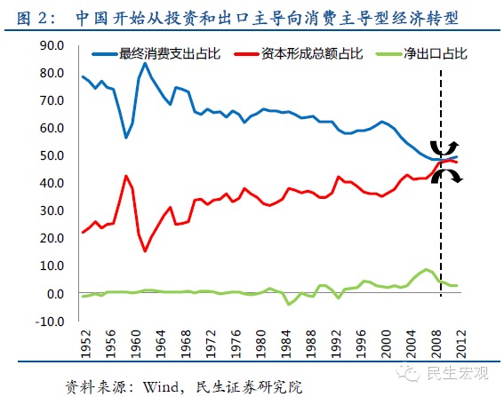 第一,外需轉向內需,但消費貢獻有限。金融危機、國外需求疲軟沖擊我國出口,國內粗放型投資引發社會和經濟問題,投資和出口型的經濟增長模式已然不適應當前發展。擴大內需成為當前我國經濟發展的主要措施。從gdp指數中二產和三產指數的同比變化來看,2010年開始二產指數同比大幅下滑,三產指數2010-2012年間同比降幅弱於二產,2013年出現回升,也就是說以工業為主的二產疲態明顯,服務業表現強於工業。但是,消費對gdp的貢獻水平仍然較低。受八項規定等事件影響,消費對gdp增長的貢獻率從2010年的56%下降至2013年的50%,投資貢獻率抬升至54%。,消費對經濟增長的基礎性作用發揮有限。