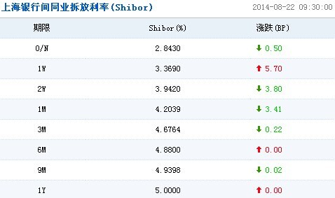 上海銀行間同業拆放利率(Shibor)顯示,隔夜Shibor報2.8430%,下跌0.50個基點;7天Shibor報3.3690%,上漲5.70個基點;1個月Shibor報4.2039%,下跌3.41個基點;3個月Shibor報4.6764%,下跌0.22個基點。