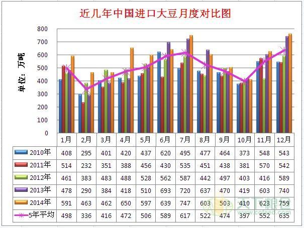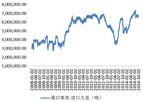 根據統計數據顯示,2014年12月份國內各港口進口大豆預報到港為127船,共計759.5萬噸,高於11月份到港量623萬噸,亦高於之前預期的730萬噸,同時也高於往年12月份到港量。中國海關總署數據顯示,2010年12月543萬噸,2011年12月542萬噸,2012年12月589萬噸,2013年12月740萬噸,5年平均水平為632萬噸。我國進口大豆月度對比如圖1所示。2014年1-12月國內大豆進口總量達7037萬噸(其中1-10月為海關統計數據,11-12月為天下糧倉調查數據),較去年1-12月份的6361萬噸增加676萬噸,增幅達10.62%。與此同時,預估2015年1月份進口大豆到港量為700萬噸,2月份預估到港量為500萬噸,3月份預估到港量為560萬噸。1-3月的進口大豆預估值均高於近5年的平均值,其均值分別為498萬噸、336萬噸以及416萬噸。上述數據清晰地顯示,未來一段時間,進口大豆到港壓力或持續存在,而當前盤面走勢在很大程度上取決於供應狀況,這也就說包括豆粕在內的豆類產品價格將承壓。與此同時,正是由於近一段時間的進口大豆到港量維持在相對較高水平,我國港口大豆庫存依然維持在相對高位,截至12月1日,港口大豆庫存水平為5154040噸,港口大豆庫存高企在一定程度上亦不利於包括豆粕在內的豆類產品價格上揚。我國港口大豆庫存走勢如圖2所示。