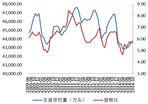 當前時點已進入12月份,元旦、春節日益臨近,這期間正是禽畜出欄高峰期,隨后養殖市場將進入低谷。統計數據顯示,養殖市場指標性數據生豬存欄量以及能繁母豬存欄量均處於相對低位水平,截至2014年10月,生豬存欄量為43541萬頭,這意味著對豆粕的需求將逐漸減少。此外,豬糧比當前值為5.87,仍處於盈虧平衡點6之下,且處於政府生豬調控預警的藍色觀察區域內,這或在一定程度上表明養殖戶的養殖利潤並不可觀,進而影響其補欄的積極性。圖6為生豬存欄量與豬糧比走勢。綜合來看,終端需求對豆粕行情的推動作用有限。而另一方面,豆粕的供給量卻在增加,按自然年度計算,2014年1月1日至12月5日,全國大豆壓榨量總計為66118741噸,較2013年同期的59935208噸增加了6183533噸,增幅為10.31%。按大豆壓榨年度計算,2014年10月1日迄今,全國大豆壓榨量總計為13016900噸,較2013/2014年度同期的11848323噸增加了1168577噸,增幅為9.86%。供應寬鬆,而需求不濟,豆粕市場疲態或將日益明顯。