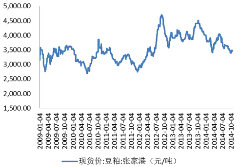 隨著進口大豆的陸續到港,預計油廠的開機率將進一步提高。依據天下糧倉網的測算,按目前油廠的開機計劃核算,在隨后一周(即第50周),全國各油廠大豆壓榨總量將提高至166萬噸,這將創周度壓榨量歷史次高水平,歷史紀錄為2013年第51周的173.746萬噸,同時也就意味著豆粕市場流通量有望繼續增加。豆粕市場流通量的增加,將令豆粕現貨價格承壓。截至12月5日,山東地區日照邦基43蛋白豆粕現貨下調至3240元/噸,1-2月提貨基差為m1501+100,3月提貨基差為m1505+170。華東地區鎮江中儲糧43蛋白豆粕價格在3200元/噸,張家港大廠43蛋白豆粕為3260元/噸。總體來看,豆粕現貨價格呈現穩中趨弱態勢運行,從而對其期價的提振與支撐作用有限。圖5為張家港豆粕現貨價格走勢。