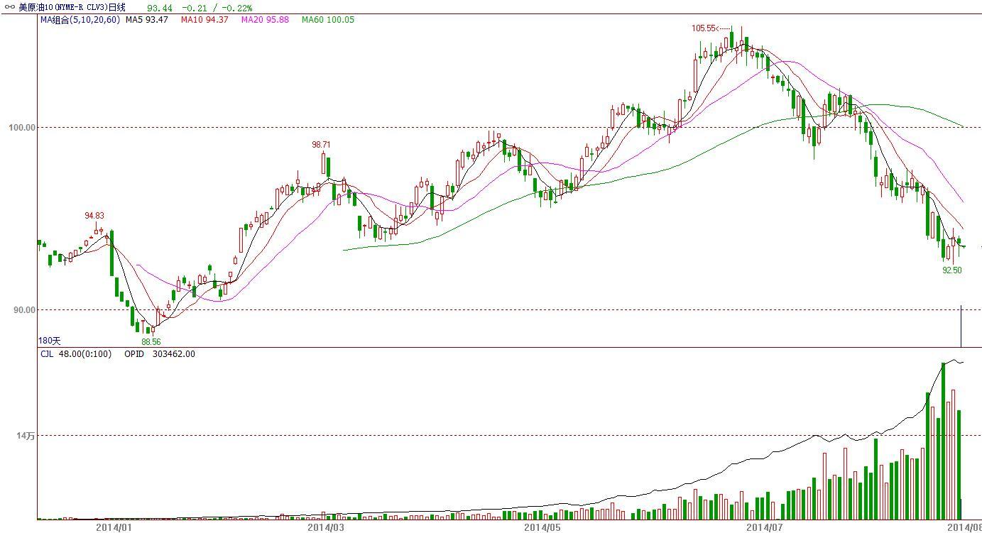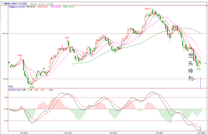 nymnex的wti原油期貨日k線圖顯示,均線系統依然呈空頭排列態勢,這暗示著后市繼續走弱的概率較大。