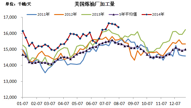 圖3:美國煉油廠日加工量