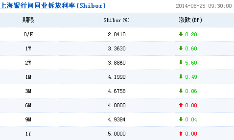 上海銀行間同業拆放利率(Shibor)顯示,隔夜Shibor報2.8410%,下跌0.20個基點;7天Shibor報3.3630%,下跌0.60個基點;一個月Shibor報4.1990%,下降0.49個基點;3個月Shibor報4.6758%,下跌0.06個基點。