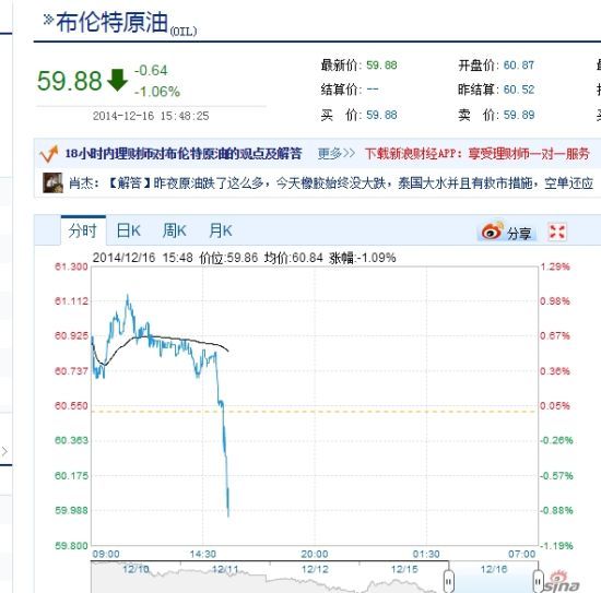 期貨快訊:布倫特原油近五年半來首次跌破60美元鉅亨網新聞中心2014-12-16 16:30 新浪財經訊 北京時間12月16日下午消息,周二國際油價跳水,布倫特原油下跌1%,跌破60美元/桶,為2009年7月以來首次。紐約原油跌幅擴大至2.06%,報54.78美元/桶。 (鐵軍)文章標籤更多鉅亨講座看更多講座公告上一篇1998年新興市場危機重現?相同點、相異點比一比下一篇金駿:黑色星期一 油價暴跌引領金銀再陷空頭0