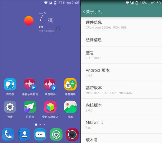 星星2號內在的另一大升級就是中興全新的MiFavor 3.0 UI,界面風格的整體性相比此前的2.3版有了明顯的提升。整體色彩更加簡潔,取消了二級程序菜單,加入了扁平化設計元素,重繪了系統應用和第三方應用的表徵圖。