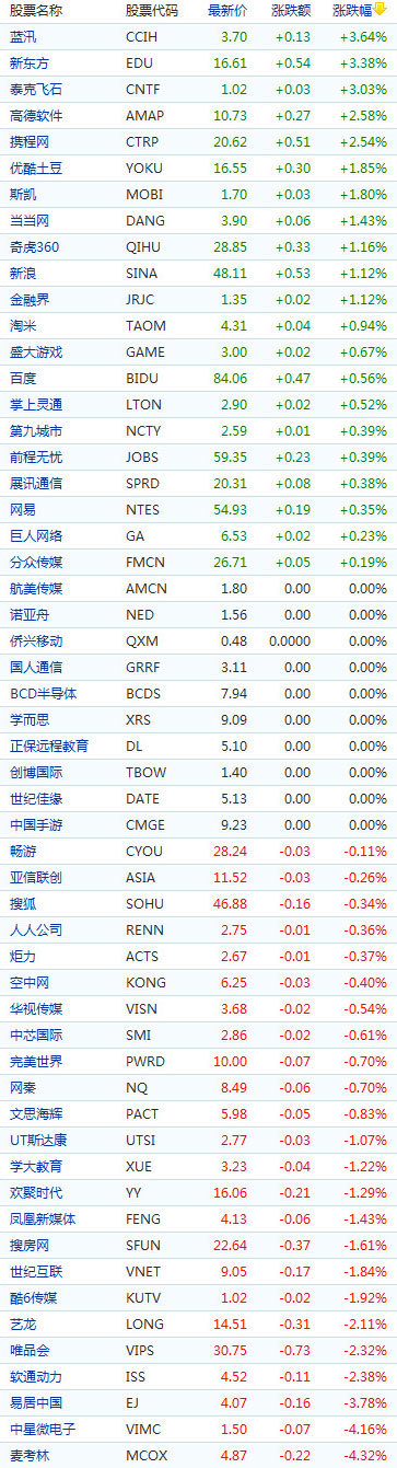 中國概念股周一早盤漲跌互現,藍汛漲3.64%,新東方漲3.38%;麥考林跌4.32%,中星微跌4.16%。