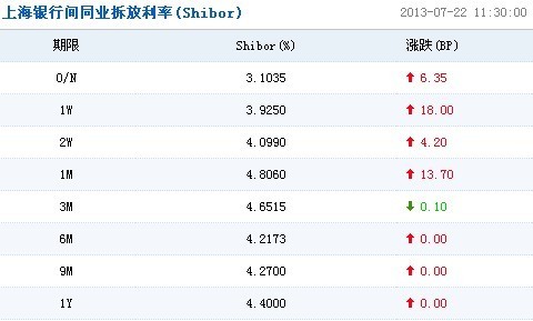 北京(CNFIN.COM / XINHUA08.COM)--22日上海銀行間同業拆放利率(Shibor)連續第三個交易日小幅反彈,其中,7天利率升至兩周來高位。渣打報告稱,中國央行全面放開金融機構貸款利率管制,預計慢慢將有部分銀行轉移采用Shibor作為制定貸款利率定價的參考基準。