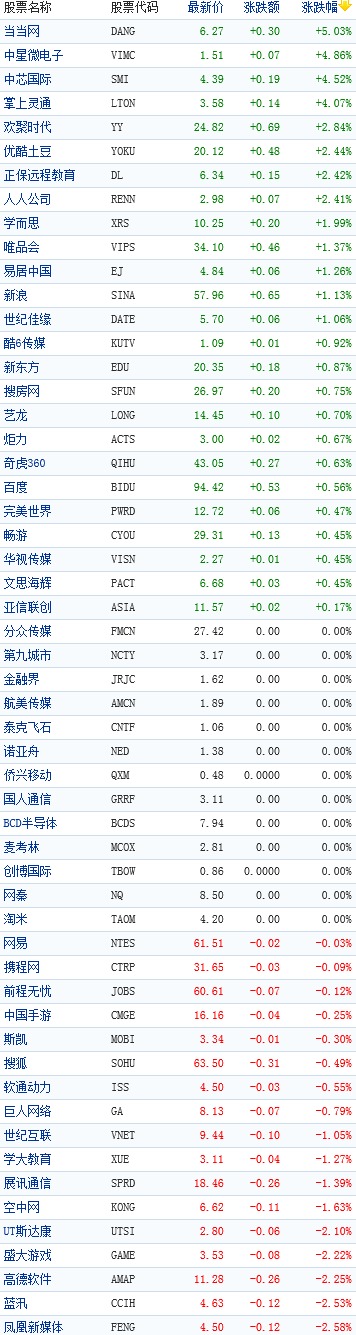中國概念股周五早盤普漲,噹噹網漲5.03%,中星微電子漲4.86%,中芯國際漲4.52%,掌上靈通漲4.07%。(晨暉)