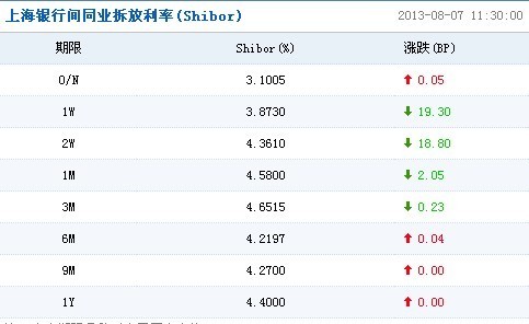 北京(CNFIN.COM/XINHUA08.COM)--北京(CNFIN.COM/XINHUA08.COM)--8月7日上海銀行間同業拆放利率(Shibor)顯示,短期利率普遍下跌,7天期利率下跌19.3個基點,14天期利率下跌18.8個基點。央行昨日續發7天期逆回購所釋放的維穩資金面的信號繼續發酵。