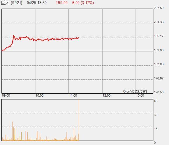 巨大股價今天終場收盤價為225元,較昨日上漲10元,成交量放大為1354張。