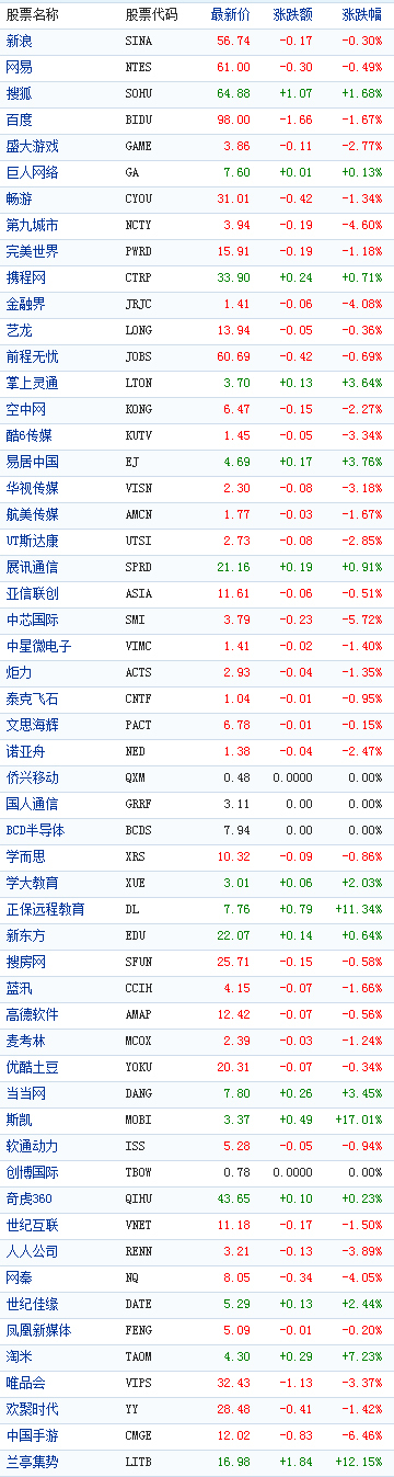 中國概念股周五收盤多數下跌,中國手游下跌6.46%。另有八隻股票跌幅超3%,中芯國際跌5.72%,第九城市跌4.60%,金融界跌4.08%,網秦跌4.05%,酷6傳媒跌3.34%,華視傳媒跌3.18%,人人公司跌3.89%,唯品會跌3.37%。漲幅方面,四隻股票漲幅超5%,其中斯凱漲17.01%,蘭亭集勢漲12.15%,正保遠程教育漲11.34%,淘米漲7.23%。