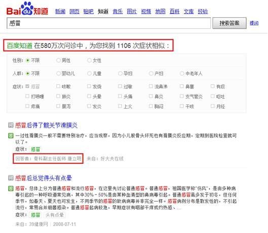 例如,在百度或者百度知道中搜索“頭疼”,網友可以根據自身情況選定性別、所屬人群、癥狀等,定製化尋醫問症各項參數,百度搜索技術則通過后台計算,智能匹配推送更精準的參考病例和更專業的針對性建議。