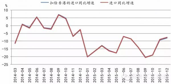 之所以去除香港因素不改變進出口走勢,是因為對香港進出口占中國總進出口比例太低了。2011年以來,對香港出口占總出口比重約為15%,2015年12月略高也僅為20%;對香港進口占中國總進口比重均值約為0.5%,2015年12月“激增65%”之后,對香港進口占中國總進口比重也僅為1.3%。用占比如此小的數據的大幅增加去解釋進出口回暖,是違背經濟學基本常識的。
