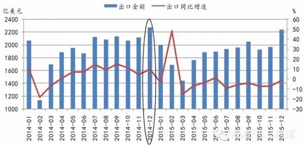 也有分析稱,12月出口上升是因為翹尾因素,12月份出口上漲是暫時的,不代表一種趨勢。需要澄清的是,12月份的出口上漲是高基數基礎上的上漲,無論是從金額角度來看還是同比增速來看,2014年12月都是高基數而不是低基數。從金額來看,2014年12月的出口金額為2274.3億美元,是全年最高值;從增速來看,2014年12月的同比增速為9.67%,為全年第五高,且遠快於2014年11月的增速(4.69%)。如果從基數視角來看,那么2015年12月的出口增速應該難以較2015年11月出現顯著改善。