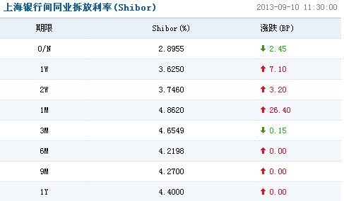 北京(CNFIN.COM / XINHUA08.COM)--6日上海銀行間同業拆放利率(Shibor)漲跌互現,隔夜利率跌2.45個基點,1個月期利率漲26.4個基點。央行周二上午進行了100億元7天期逆回購,規模持平於上周,中標利率維持在3.9%不變。