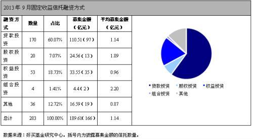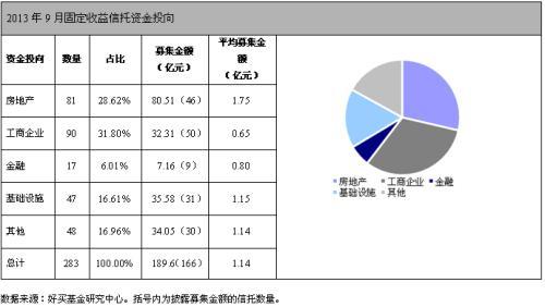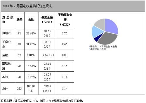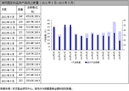 2013年9月,46家信托公司共成立283只固定收益信托產品,納入統計的166只產品總規模為189.61億元,平均每只產品規模為1.14億元,成立總規模較8月減少45.40%,同比減少59.71%。