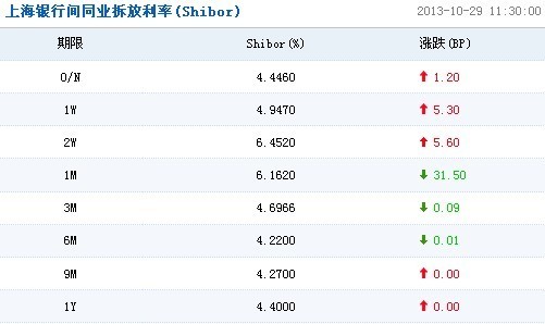 29日上海銀行間同業拆放利率(Shibor)顯示,短期利率方面,隔夜利率漲1.2個基點,至4.4460%;7天期利率漲5.3個基點,至4.9470%;14天期利率漲5.6個基點,至6.4520%;1個月期利率跌31.5個基點,至6.1620%。