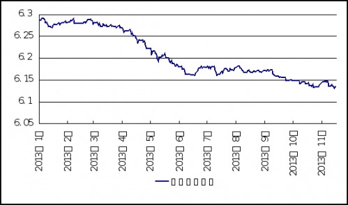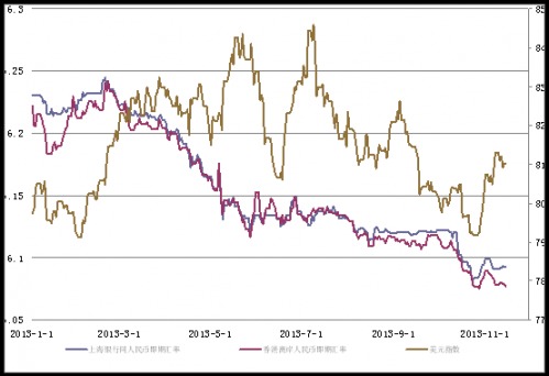 當周人民幣兌美元中間價走勢先漲后跌?周四,美聯儲副主席的講話並無意外地緩解了對美國逐步退出量化寬鬆政策的預期,令美元指數整體承壓回落,人民幣中間價順勢更新歷史高點,報6.1315?然而,周五中間價又出現回落至6.1351,全周僅累計上行4個基點?即期匯率方面,當周市場一直等待著十八屆三中全會的政策方向,市場交投心理謹慎,盤整態勢明顯,前三日微幅走跌,周四微幅上漲后走平,且日均波幅都在10個基點以內,全周累計下行17個基點,交易顯示,在6.09元一線,大行購匯盤仍然較多,即期價格短期料仍難以突破該阻力位?在三中全會改革方案細節出爐之前,盤面可能繼續維持窄幅波動?